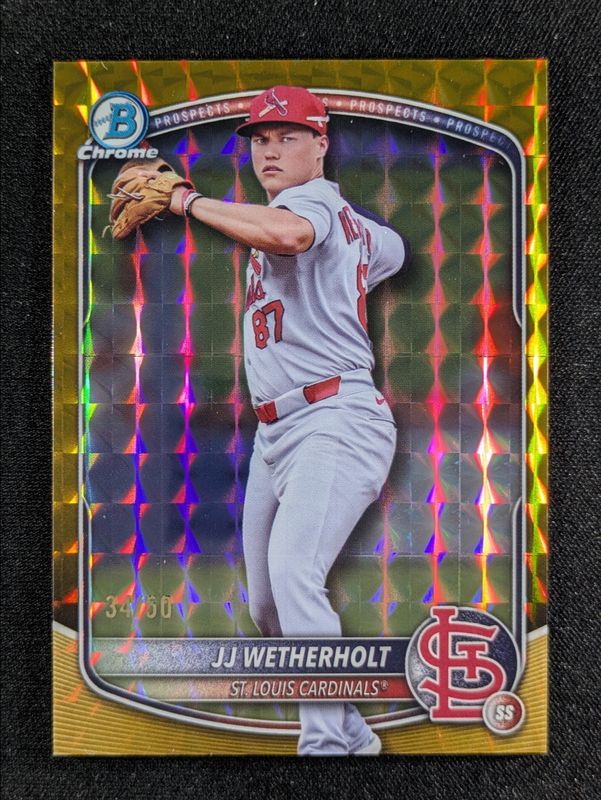 The JJ Wetherholt 2025 Bowman Draft #BDC-145 Chrome - Gold Geometric Refractor /50 card is 1 of 95 JJ Wetherholt's card variations in the 2025 Bowman Draft set being tracked by Sports Card Investor, including Base, Chrome, Chrome - Lazer Refractor, Chrome - Refractor, and Chrome - Sky Blue Refractor.