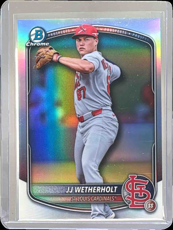 The JJ Wetherholt 2025 Bowman Draft #BDC-145 Chrome - Refractor card is 1 of 95 JJ Wetherholt's card variations in the 2025 Bowman Draft set being tracked by Sports Card Investor, including Base, Chrome, Chrome - Lazer Refractor, Chrome - Sky Blue Refractor, and Chrome - X-Fractor.