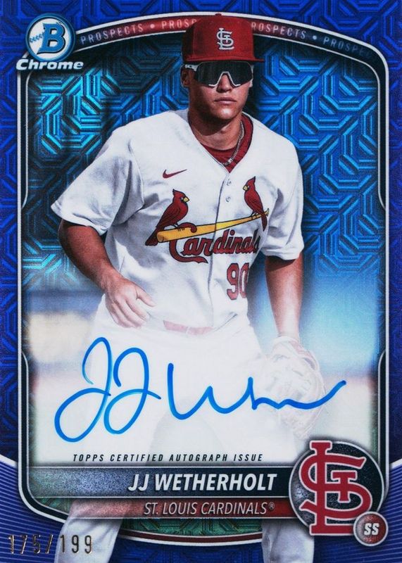 This card is 1 of 23 JJ Wetherholt's card variations in the 2025 Bowman Mega Box set being tracked by Sports Card Investor, including Chrome Prospects (1st), Chrome Prospects - Fuchsia Refractor /299 (1st), Chrome Prospects - Burgundy Refractor /275 (1st), Chrome Prospects - Purple Refractor /250 (1st), and Chrome Prospects - Pink Refractor /199 (1st).