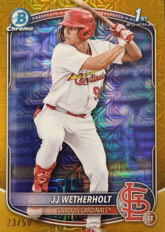 This card is 1 of 23 JJ Wetherholt's card variations in the 2025 Bowman Mega Box set being tracked by Sports Card Investor, including Chrome Prospects (1st), Chrome Prospects - Fuchsia Refractor /299 (1st), Chrome Prospects - Burgundy Refractor /275 (1st), Chrome Prospects - Purple Refractor /250 (1st), and Chrome Prospects - Pink Refractor /199 (1st).