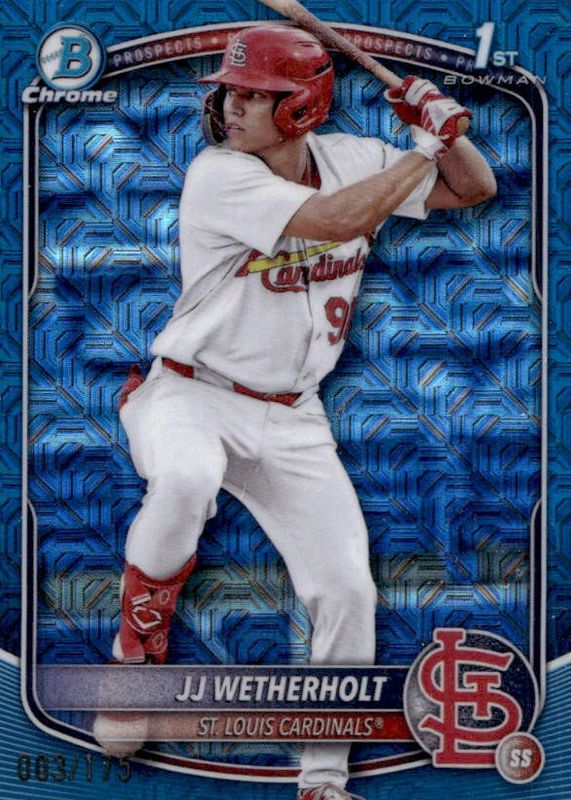This card is 1 of 23 JJ Wetherholt's card variations in the 2025 Bowman Mega Box set being tracked by Sports Card Investor, including Chrome Prospects (1st), Chrome Prospects - Fuchsia Refractor /299 (1st), Chrome Prospects - Burgundy Refractor /275 (1st), Chrome Prospects - Purple Refractor /250 (1st), and Chrome Prospects - Pink Refractor /199 (1st).