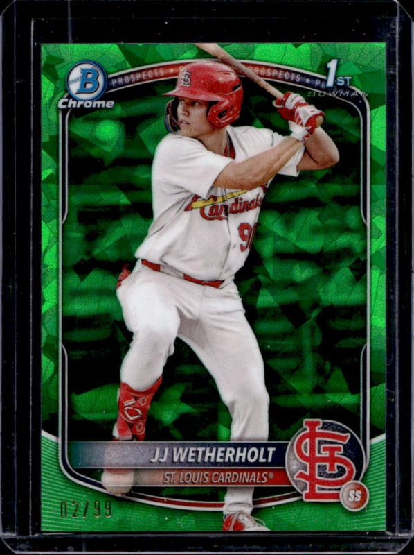 The JJ Wetherholt 2025 Bowman Sapphire Edition #BCP-22 Chrome Prospects - Green Refractor /99 card is 1 of 25 JJ Wetherholt's card variations in the 2025 Bowman Sapphire Edition set being tracked by Sports Card Investor, including Chrome Prospects, Sapphire Selections, Sapphire Selections Autographs, Chrome Prospect Autographs /199, and Chrome Prospect Autographs - Green Refractor /99.