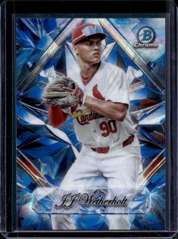 The JJ Wetherholt 2025 Bowman Sapphire Edition #BSS-9 Sapphire Selections card is 1 of 25 JJ Wetherholt's card variations in the 2025 Bowman Sapphire Edition set being tracked by Sports Card Investor, including Chrome Prospects, Sapphire Selections Autographs, Chrome Prospect Autographs /199, Chrome Prospect Autographs - Green Refractor /99, and Chrome Prospects - Green Refractor /99.