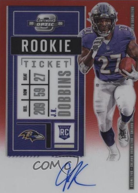 Best Prices Available For Sale of JK Dobbins 2020 Contenders Optic #123 Rookie Ticket Auto - Red /199