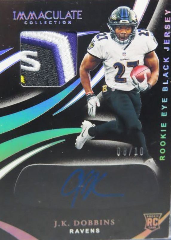 The JK Dobbins 2020 Immaculate #REB-9 Immaculate Rookie Eye Black Jersey Autographs - Metallic /10 card in Raw condition has not changed in price in the last 30 days and was last sold for $22.50 .