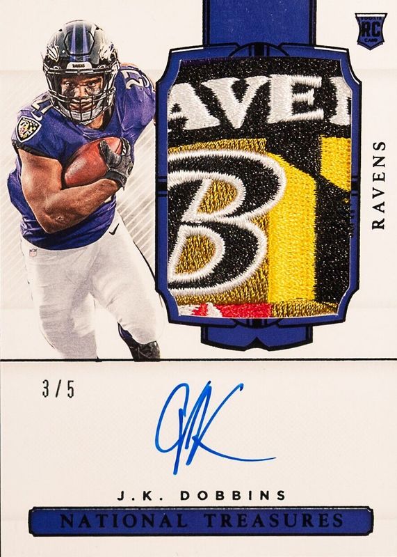 This card is 1 of 49 JK Dobbins' card variations in the 2020 National Treasures set being tracked by Sports Card Investor, including Rookie Patch Auto /99, Rookie Patch Auto - Green Jersey Number (/27), Rookie Patch Auto - Holo Silver /25, Rookie Patch Auto - Midnight /20, and Rookie Patch Auto - Stars & Stripes /20.