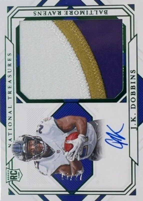 This card is 1 of 49 JK Dobbins' card variations in the 2020 National Treasures set being tracked by Sports Card Investor, including Rookie Patch Auto /99, Rookie Patch Auto - Holo Silver /25, Rookie Patch Auto - Midnight /20, Rookie Patch Auto - Stars & Stripes /20, and Rookie Patch Auto - Holo Gold /10.