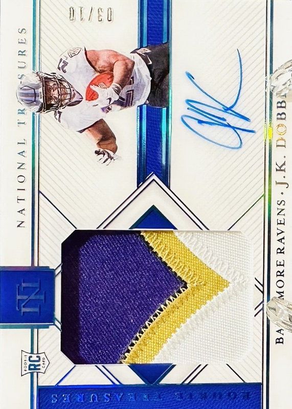 The JK Dobbins 2020 National Treasures #RT-JD Rookie Treasures /10 card in Raw condition has not changed in price in the last 30 days and was last sold for $33.31 .