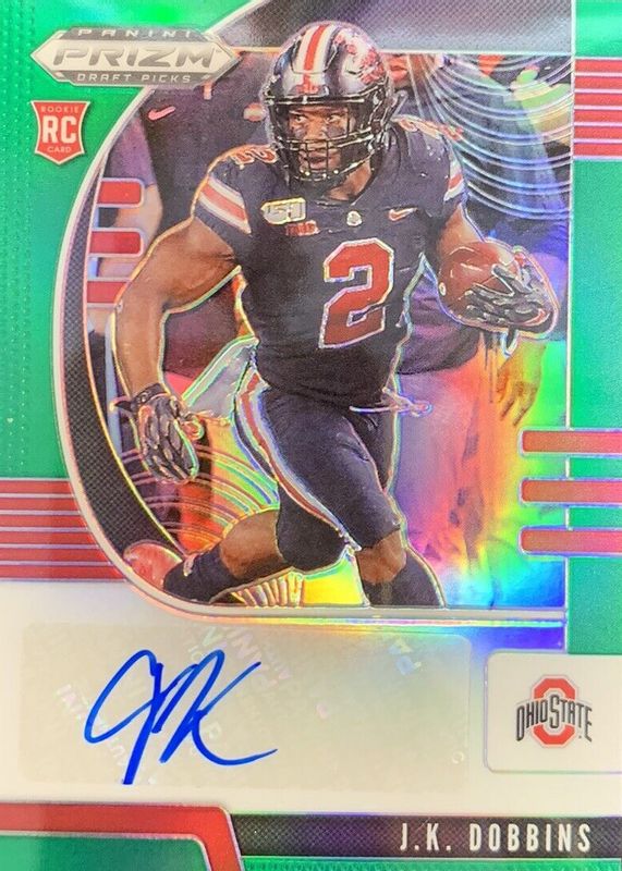 The JK Dobbins 2020 Prizm Draft Picks #114 Autographs - Green Rookie card in Raw condition has not changed in price in the last 30 days and was last sold for $20.00 .