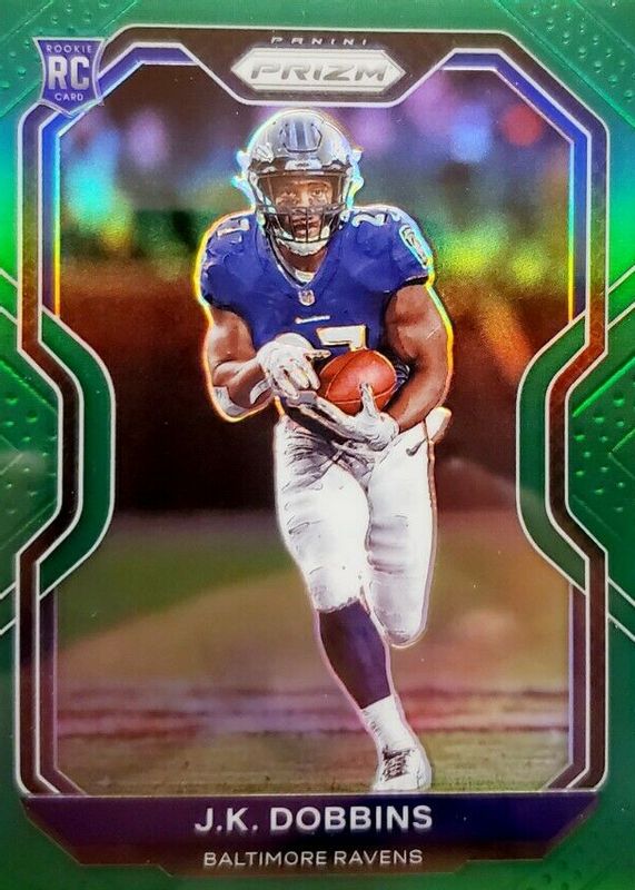 The JK Dobbins 2020 Prizm #379 Green Rookie card in Raw condition has moved down -$0.61 (-38.1%) in the last 30 days and was last sold for $0.99 .