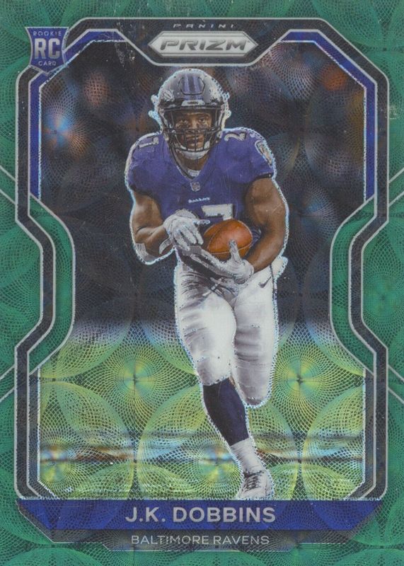 2020 PRIZM ROOKIE GREEN SCOPE RAVENS #379 J.K. DOBBINS RC /75 Q0197