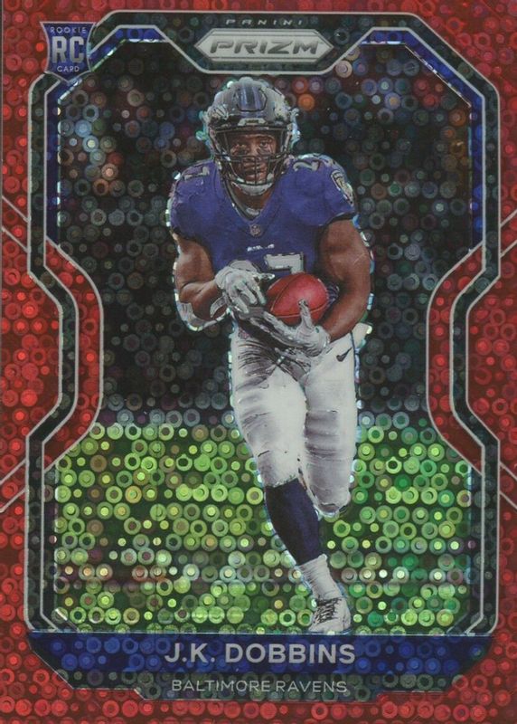 J.K. Dobbins 2020 Panini Prizm 379 Disco Red No Huddle RC /50 Ravens Rookie JK