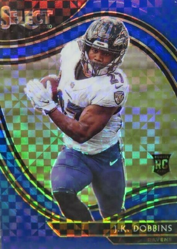 The JK Dobbins 2020 Select #352 Field Level Blue /49 Rookie card in Raw condition has not changed in price in the last 30 days and was last sold for $1.25 .