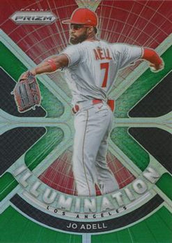 The Jo Adell 2021 Prizm #IL-1 Illumination - Green Rookie card is 1 of 123 Jo Adell's card variations in the 2021 Prizm set being tracked by Sports Card Investor, including Base, Blue, Blue Velocity, Carolina Blue, and Cosmic Haze.