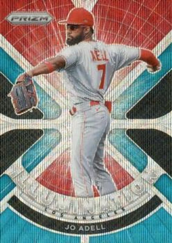 The Jo Adell 2021 Prizm #IL-1 Illumination - Teal Wave Rookie card is 1 of 123 Jo Adell's card variations in the 2021 Prizm set being tracked by Sports Card Investor, including Base, Blue, Blue Velocity, Carolina Blue, and Cosmic Haze.