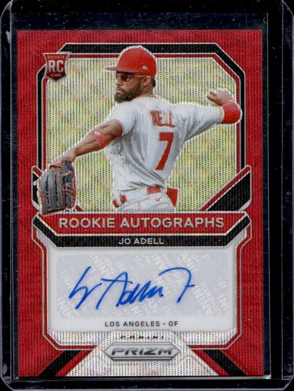 The Jo Adell 2021 Prizm #RA-JOA Rookie Autographs - Red Wave /75 card is 1 of 123 Jo Adell's card variations in the 2021 Prizm set being tracked by Sports Card Investor, including Base, Blue, Blue Velocity, Carolina Blue, and Cosmic Haze.