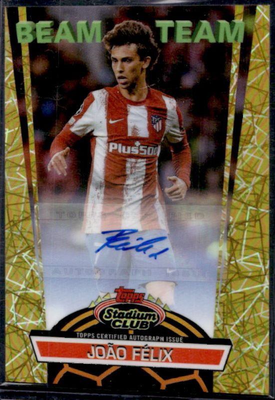 The Joao Felix 2021 Topps Stadium Club Chrome UEFA Champions League #BTA-JF 1992 Beam Team Autographs - Gold Refractor /50 card is 1 of 42 Joao Felix's card variations in the 2021 Topps Stadium Club Chrome UEFA Champions League set being tracked by Sports Card Investor, including Base, Blue Prism Refractor, Pink Red Electric Charge Refractor, Refractor, and Black & White Refractor /299.
