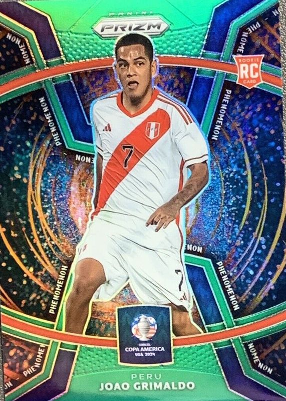 The Joao Grimaldo 2024 Prizm Copa America #35 Phenomenon - Green /5 Rookie card in Raw condition has not changed in price in the last 30 days and was last sold for $100.00 .