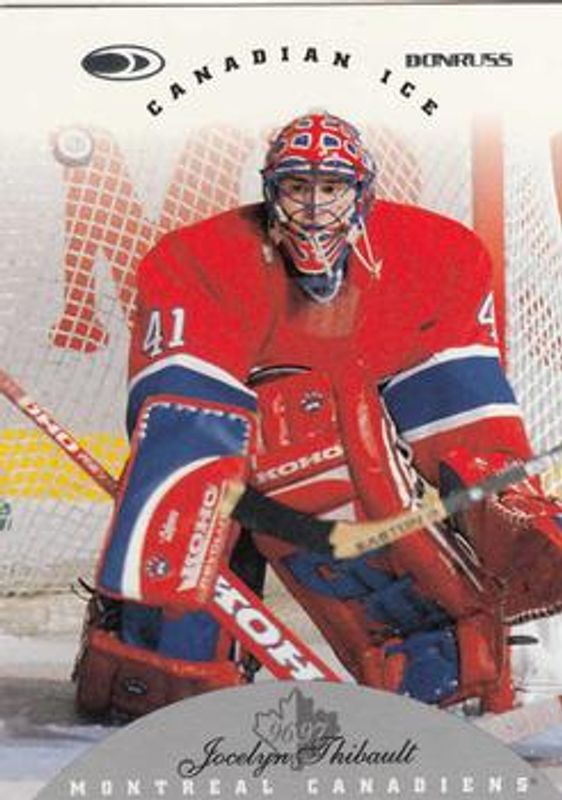 The Jocelyn Thibault 1996 Donruss Canadian Ice #2 Base card is 1 of 5 Jocelyn Thibault's card variations in the 1996 Donruss Canadian Ice set being tracked by Sports Card Investor, including Canadian Gold Press Proofs, Les Gardiens Executive Proofs, Canadian Red Press Proofs /75, and Les Gardiens /1500.