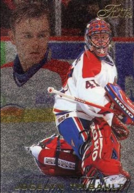 The Jocelyn Thibault 1996 Flair #51 Base card is 1 of 3 Jocelyn Thibault's card variations in the 1996 Flair set being tracked by Sports Card Investor, including Blue Ice Collection /250, and Hot Gloves.