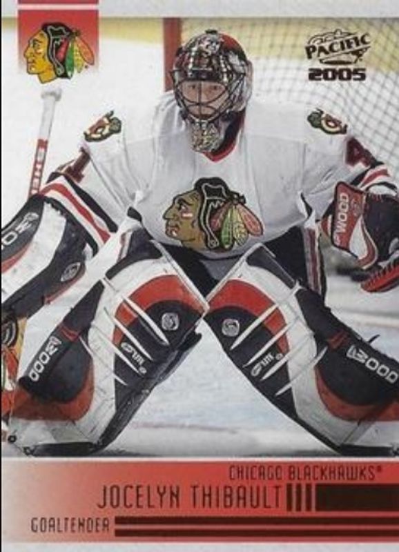 The Jocelyn Thibault 2004 Pacific #63 Red card is 1 of 5 Jocelyn Thibault's card variations in the 2004 Pacific set being tracked by Sports Card Investor, including Base, Blue /250, Jerseys /850, and Jerseys - Gold /50.
