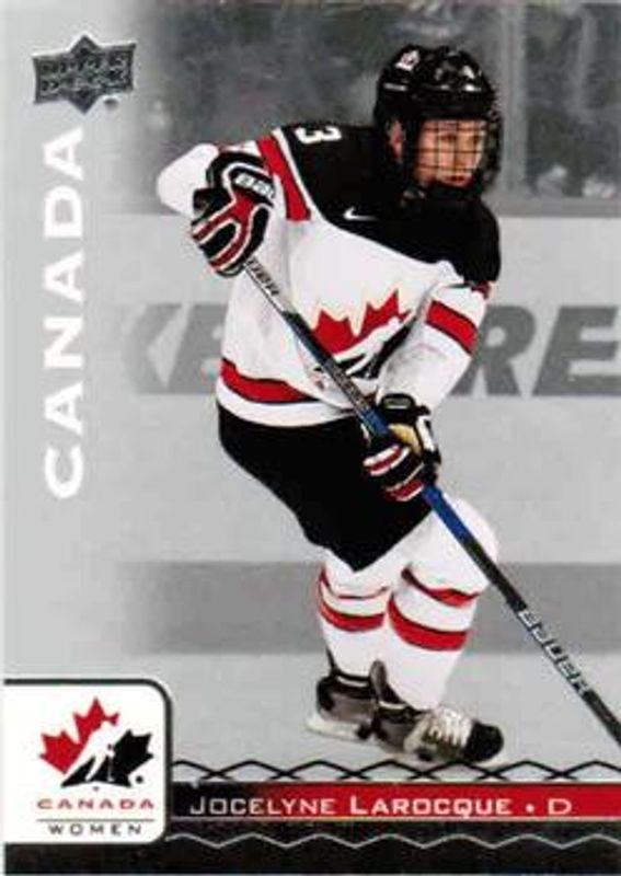 The Jocelyne Larocque 2017 Upper Deck Team Canada Juniors #19 Base card is 1 of 11 Jocelyne Larocque's card variations in the 2017 Upper Deck Team Canada Juniors set being tracked by Sports Card Investor, including Blue Spectrum, Red Exclusives /199, High Gloss /25, Black Parallel /5, and Canada Jerseys.