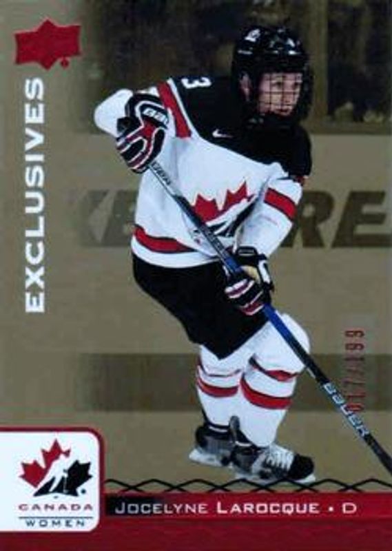 The Jocelyne Larocque 2017 Upper Deck Team Canada Juniors #19 Red Exclusives /199 card is 1 of 11 Jocelyne Larocque's card variations in the 2017 Upper Deck Team Canada Juniors set being tracked by Sports Card Investor, including Base, Blue Spectrum, High Gloss /25, Black Parallel /5, and Canada Jerseys.