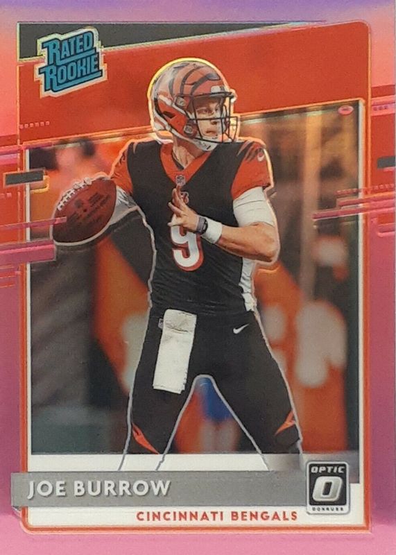 The Joe Burrow 2020 Donruss #P-301 Optic Preview - Pink Rookie card in Raw condition has not changed in price in the last 30 days and was last sold for $65.00 .