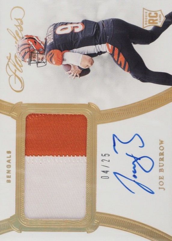 The Joe Burrow 2020 Flawless #RPA-JBU Rookie Patch Auto /25 card in Raw condition has not changed in price in the last 30 days and was last sold for $3,970.80 .