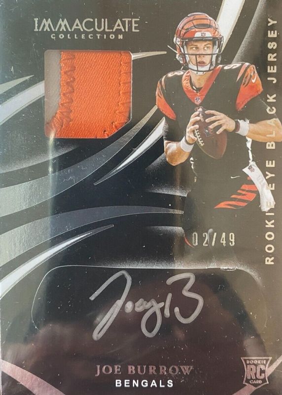 The Joe Burrow 2020 Immaculate #REB-1 Immaculate Rookie Eye Black Jersey Autographs (/49) card in Raw condition has not changed in price in the last 30 days and was last sold for $490.00 .