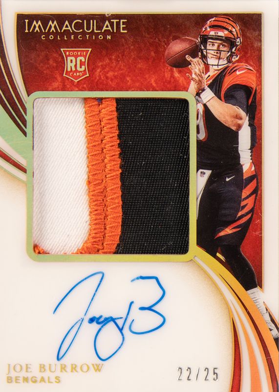 The Joe Burrow 2020 Immaculate #PPR-JBU Premium Patch Rookie Autographs - Gold /25 card in Raw condition has not changed in price in the last 30 days and was last sold for $4,028.40 .