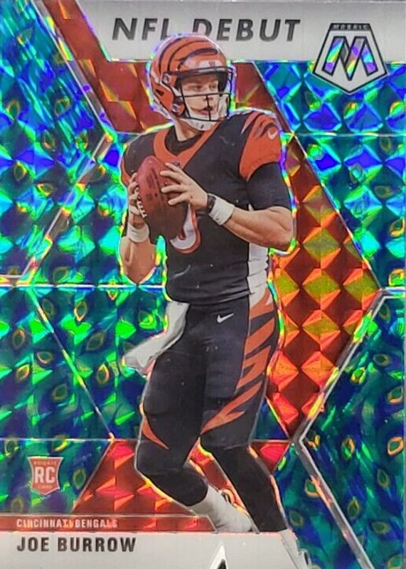 The Joe Burrow 2020 Mosaic #261 NFL Debut - Choice Peacock /(SSP) Rookie card in Raw condition has not changed in price in the last 30 days and was last sold for $444.00 .