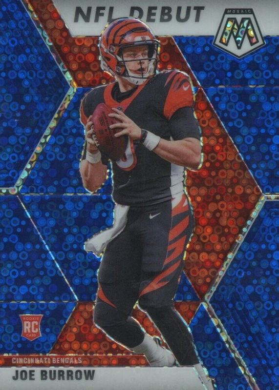 The Joe Burrow 2020 Mosaic #261 NFL Debut - No Huddle Blue /75 Rookie card in Raw condition has not changed in price in the last 30 days and was last sold for $129.00 .