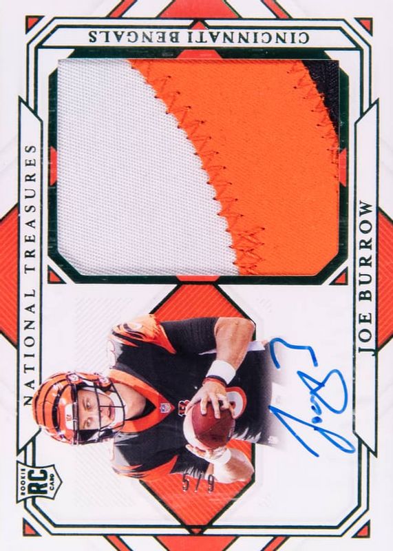 This card is 1 of 50 Joe Burrow's card variations in the 2020 National Treasures set being tracked by Sports Card Investor, including Rookie Patch Auto /99, Rookie Patch Auto - Green Jersey Number (/9), Rookie Patch Auto - Holo Silver /25, Rookie Patch Auto - Midnight /20, and Rookie Patch Auto - Stars & Stripes /20.