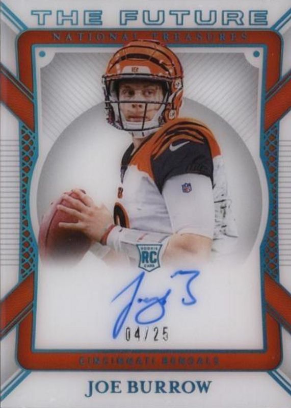 The Joe Burrow 2020 National Treasures #TF-JB The Future Autographs /25 Rookie card in Raw condition has not changed in price in the last 30 days and was last sold for $1,580.00 .