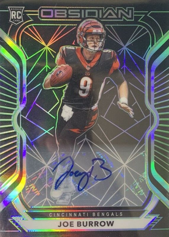 This card is 1 of 22 Joe Burrow's card variations in the 2020 Obsidian set being tracked by Sports Card Investor, including Base, Rookie Autographs (/50), Rookie Autographs - Electric Etch Orange (/25), Rookie Autographs - Electric Etch Red (/5), and Rookie Autographs - Electric Etch Yellow (/10).