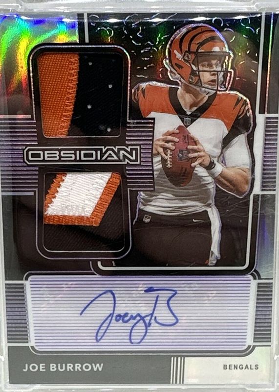 This card is 1 of 22 Joe Burrow's card variations in the 2020 Obsidian set being tracked by Sports Card Investor, including Base, Rookie Autographs (/50), Rookie Autographs - Electric Etch Green (/15), Rookie Autographs - Electric Etch Orange (/25), and Rookie Autographs - Electric Etch Red (/5).
