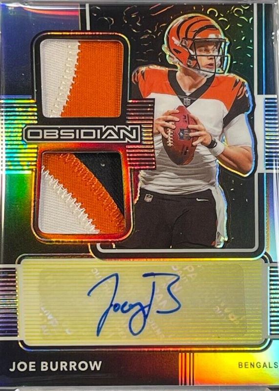 This card is 1 of 22 Joe Burrow's card variations in the 2020 Obsidian set being tracked by Sports Card Investor, including Base, Rookie Autographs (/50), Rookie Autographs - Electric Etch Green (/15), Rookie Autographs - Electric Etch Orange (/25), and Rookie Autographs - Electric Etch Red (/5).
