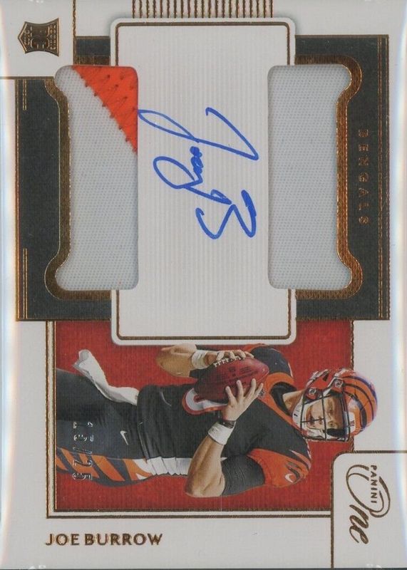 This card is 1 of 32 Joe Burrow's card variations in the 2020 One set being tracked by Sports Card Investor, including Precision Rookie Patch Autographs (/35), Rookie Autographs (/49), Rookie Autographs - Blue (/35), Rookie Autographs - Bronze (/15), and Rookie Autographs - Gold (/5).