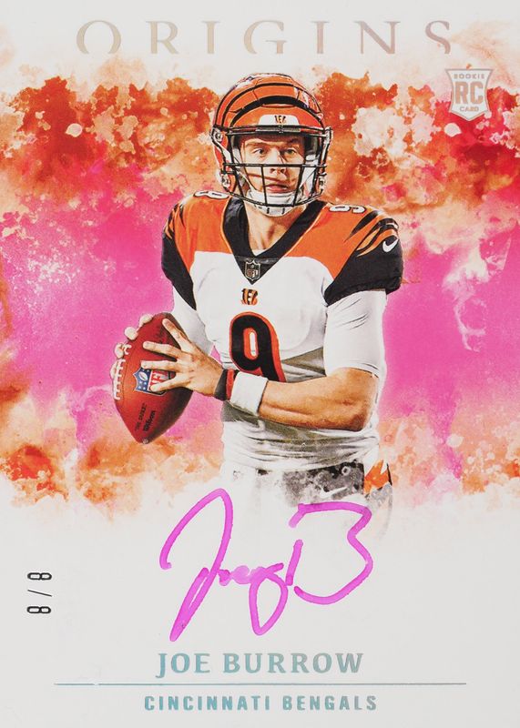 Auctions Ending Soon for Joe Burrow 2020 Origins #RA-JB Rookie Autographs - Pink FOTL /8 BGS 8