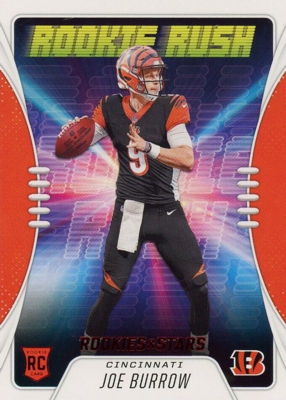 The Joe Burrow 2020 Rookies & Stars #RR-1 Rookie Rush card in Raw condition has moved up $1.82 (+91.0%) in the last 30 days and was last sold for $3.82 .
