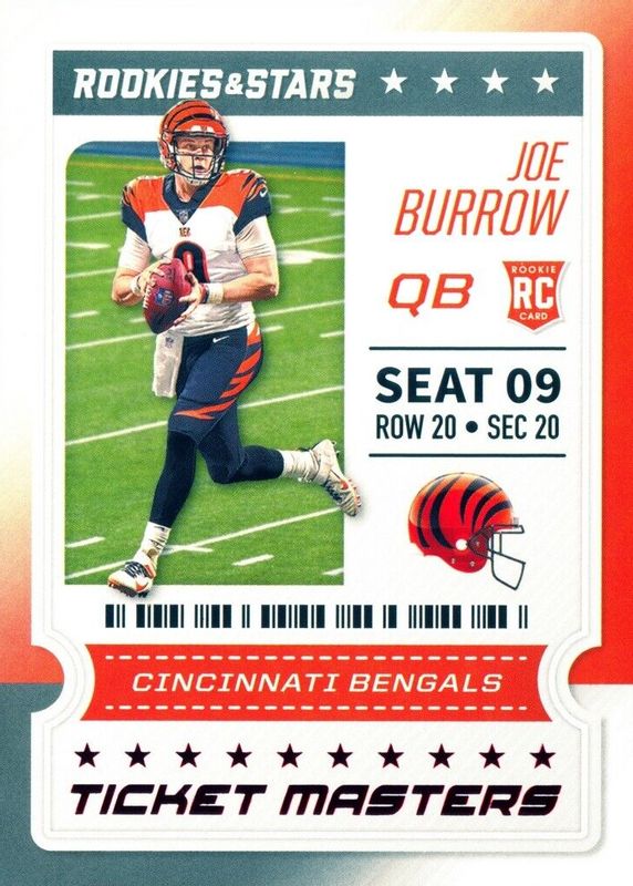 The Joe Burrow 2020 Rookies & Stars #11 Ticket Masters card in Raw condition has moved up $3.01 (+151%) in the last 30 days and was last sold for $5.00 .