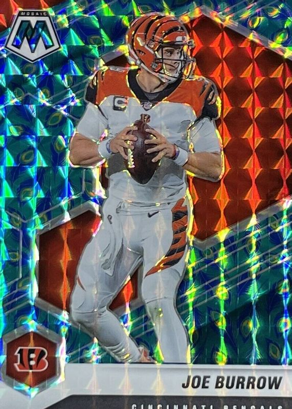 The Joe Burrow 2021 Mosaic #47 Choice Peacock /(SSP) card in Raw condition has not changed in price in the last 30 days and was last sold for $455.00 .