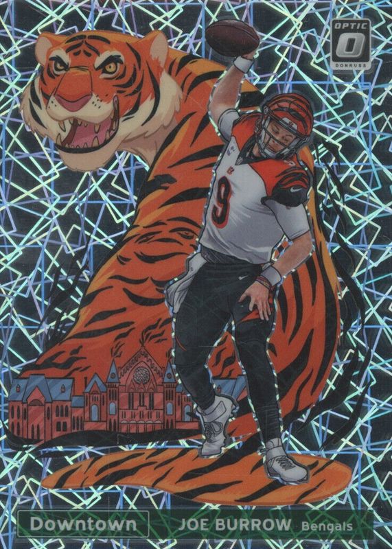 The Joe Burrow 2021 Optic #DT-10 Downtown /(SSP) card in Raw condition has moved up $85.00 (+12.1%) in the last 30 days and was last sold for $785.00 .