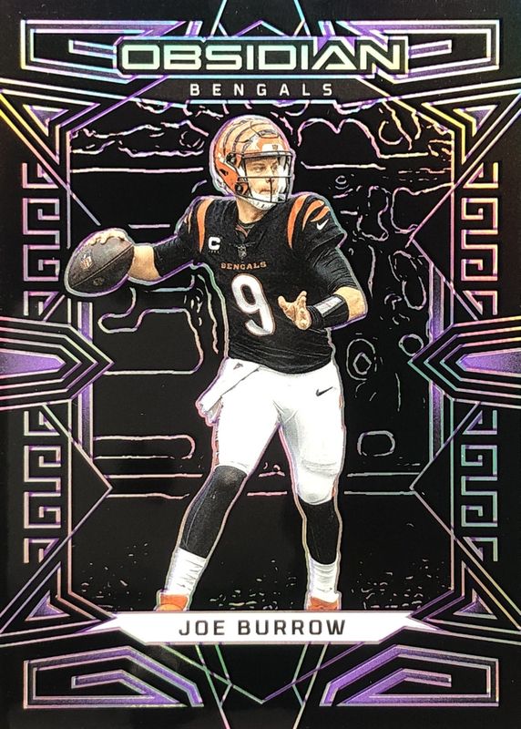 This card is 1 of 14 Joe Burrow's card variations in the 2023 Obsidian set being tracked by Sports Card Investor, including Electric Etch Red Flood /90, Electric Etch Contra /(SSP), Electric Etch Orange /49, Electric Etch Green /25, and Electric Etch Purple Flood /13.