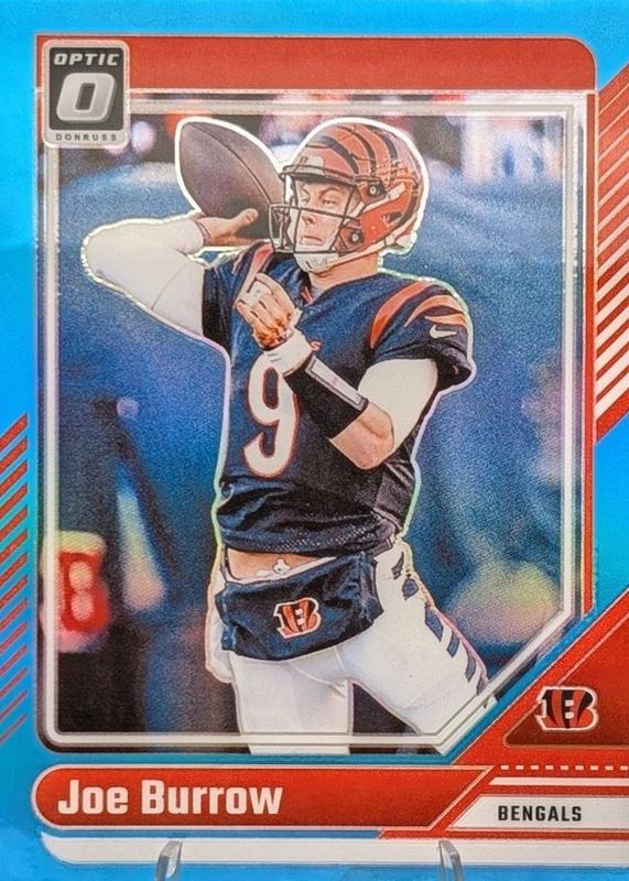 The Joe Burrow 2024 Optic #38 Aqua /299 card in Raw condition has moved down -$4.00 (-40.0%) in the last 30 days and was last sold for $6.00 .