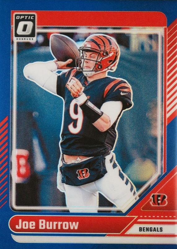 The Joe Burrow 2024 Optic #38 Blue /199 card in Raw condition has moved up $1.49 (+59.6%) in the last 30 days and was last sold for $3.99 .