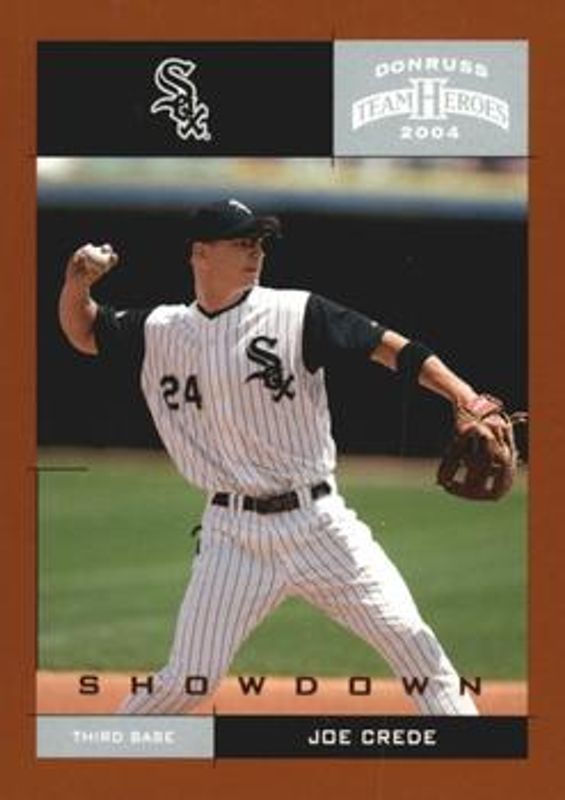 The Joe Crede 2004 Donruss Team Heroes #88 Showdown - Bronze /150 card is 1 of 5 Joe Crede's card variations in the 2004 Donruss Team Heroes set being tracked by Sports Card Investor, including Base, Showdown - Silver /50, Showdown - Gold /10, and Autographs /10.
