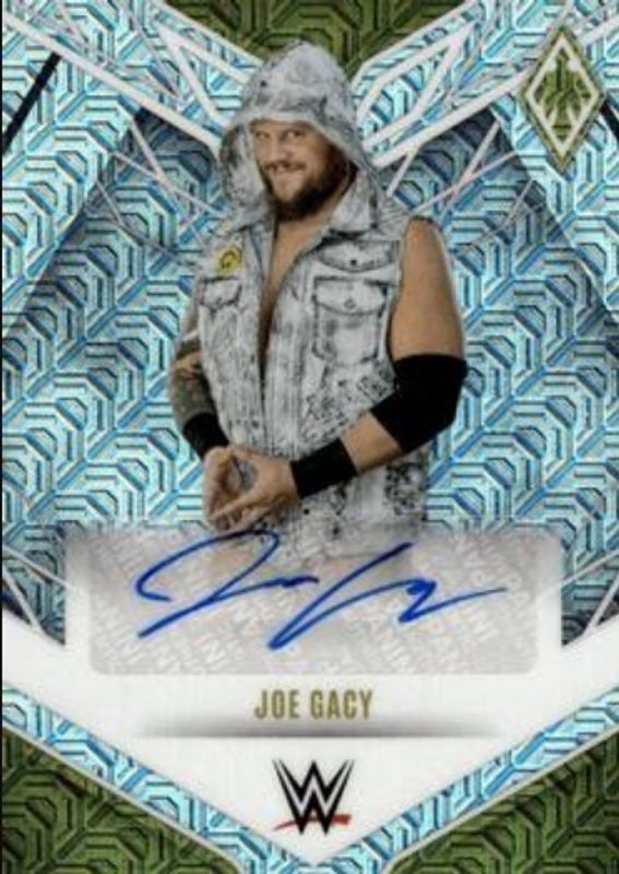The Joe Gacy 2023 Chronicles WWE #PA-JOE Phoenix Autographs - Mojo /25 card is 1 of 16 Joe Gacy's card variations in the 2023 Chronicles WWE set being tracked by Sports Card Investor, including Base, Bronze, Pink /199, Red /199, and Blue /99.