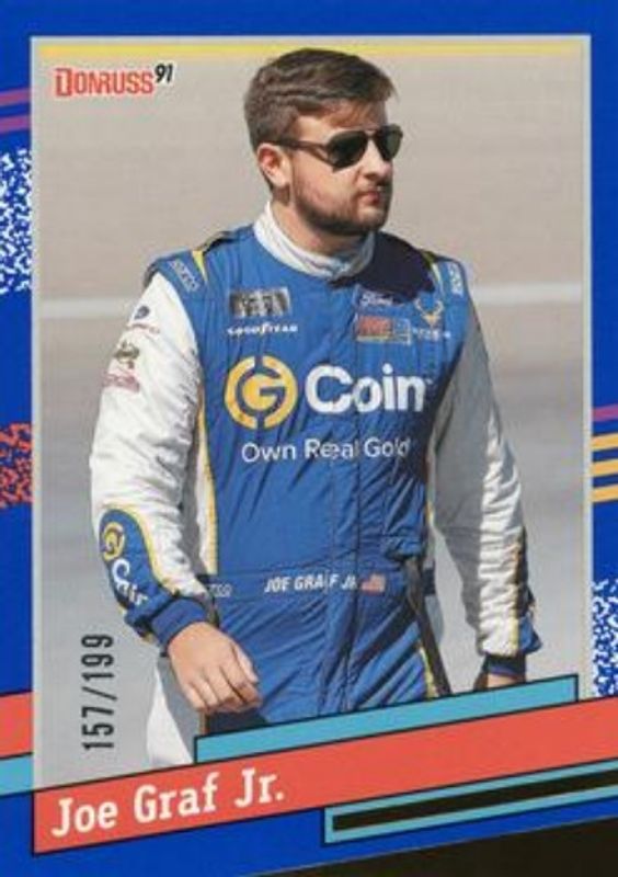 The Joe Graf Jr. 2024 Donruss NASCAR #131 Blue /199 card is 1 of 34 Joe Graf Jr.'s card variations in the 2024 Donruss NASCAR set being tracked by Sports Card Investor, including Base, Optic, Optic Black Pandora, Optic Blue Velocity, and Optic Holo.